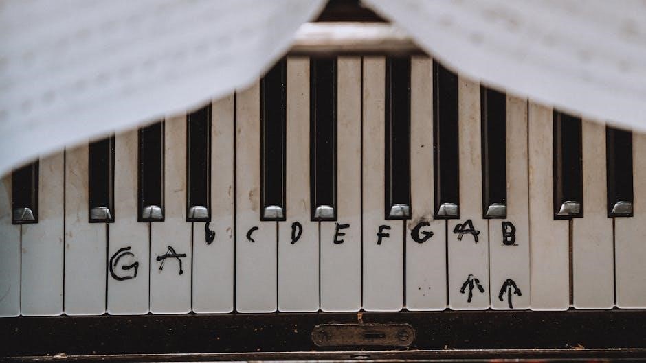 Beginner piano PDFs heavily rely on understanding these elements․ Learning to identify notes on the staff—A, B, C, D, E, F, and G—is crucial for decoding sheet music and progressing in piano studies․ Mastering this foundation unlocks musical literacy․